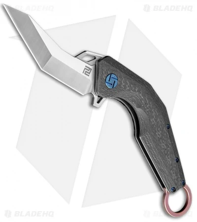 Add a unique tactical design to your collection with the Artisan Cutlery Cobra. This model sports a carbon fiber handle with a rose colored frame and a modified tanto blade. The handle features a break-away karambit ring that can double as a clip for securing to a pack or belt loop. The curved handle fits snugly in the hand with the flipper acting as a guard in the open position. Upgrade your tactical game with the Artisan Cutlery Cobra.
