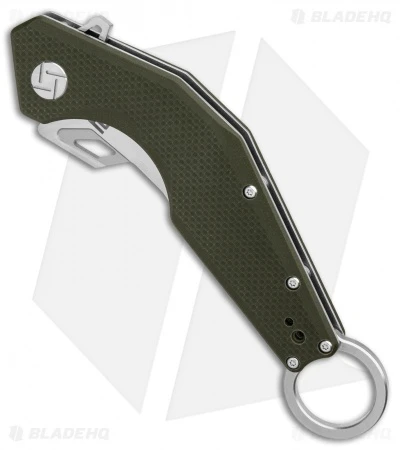 - Curved handle with a finger ring and green G-10 scales.