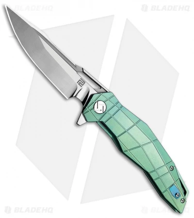 The Artisan Cutlery Pangolin was designed with a unique profile that will look great in your collection. This model sports a green titanium handle and a modified drop point blade. A ceramic ball bearing pivot offers smooth deployment with the aid of a flipper. An anodized pivot collar and a deep carry pocket clip finish off the design.