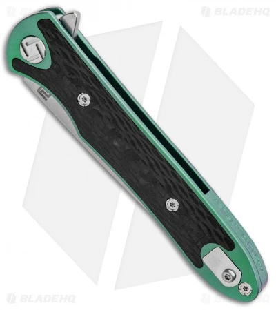 - Green titanium handle with a carbon fiber overlay.
