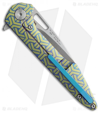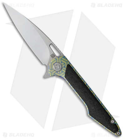 This model of the Artisan Cutlery Small Archaeo features a blue and green coated titanium handle with a satin Bohler M390 blade and satin hardware.