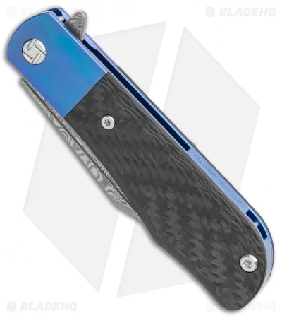 This Small Hyperion has a blue titanium frame with a Damascus blade.
